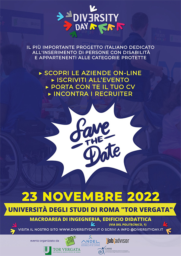 Torna a Roma il Diversity Day, il più importante evento italiano dedicato all’inserimento e all’inclusione lavorativa di persone con disabilità e appartenenti a categorie protette ex L. 68/99. La manifestazione, organizzata da Value People, Andel e Jobadvisor in collaborazione con CARIS (Commissione dell’Ateneo di Roma Tor Vergata per l’inclusione degli studenti con disabilità e Disturbi Specifici dell’Apprendimento), si svolgerà il 23 novembre presso l’Università degli Studi di Roma Tor Vergata.