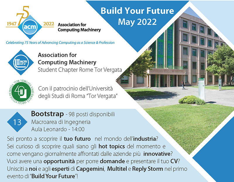 All’interno di tale ciclo, l’A.C.M. Student Chapter Rome Tor Vergata è felice di invitarvi all’evento BOOTSTRAP, nel corso del quale i relatori di Capgemini, Multitel e Reply Storm, dopo una breve presentazione aziendale, illustreranno a turno dei case studies da loro affrontati recentemente, che permetteranno ai partecipanti di conoscere problemi reali e quotidiani in ambito industriale.