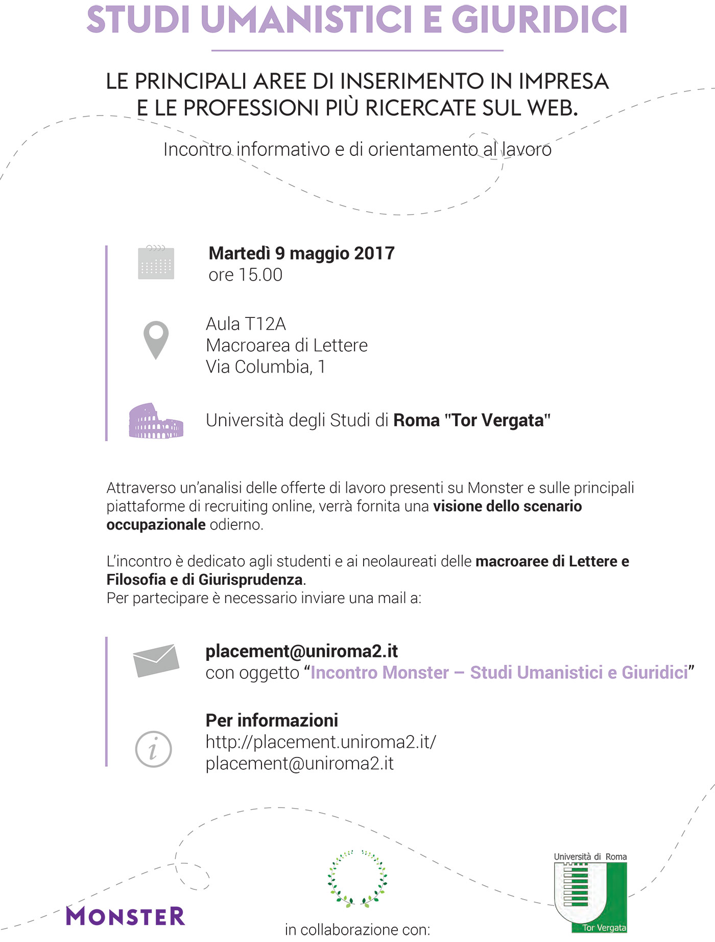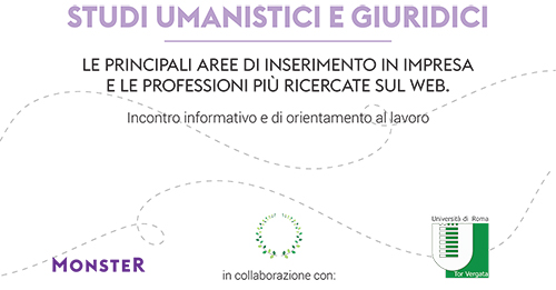 Per partecipare è necessario inviare una mail a placement@uniroma2.it con oggetto “Incontro Monster – Studi Umanistici e Giuridici”, indicando il tipo di Corso o Laurea.