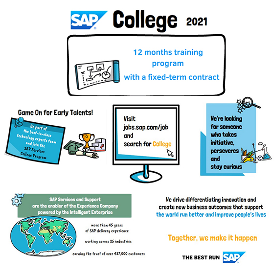 SAP College Program, promoted by SAP Services and Support, provides young university students and graduates with the opportunity to find purpose in their careers covering the future role of business process or technology consultant.
