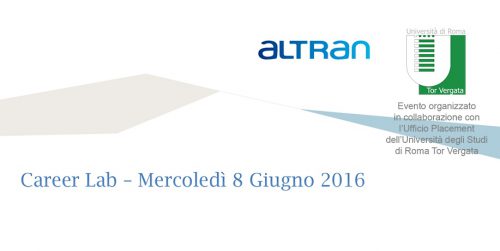 Mercoledì 8 giugno alle ore 14.00, nell’Aula C9 della Macroarea di Ingegneria (Viale del Politecnico, 1), si terrà l’evento ‘Career Lab’, organizzato in collaborazione con Altran Italia.